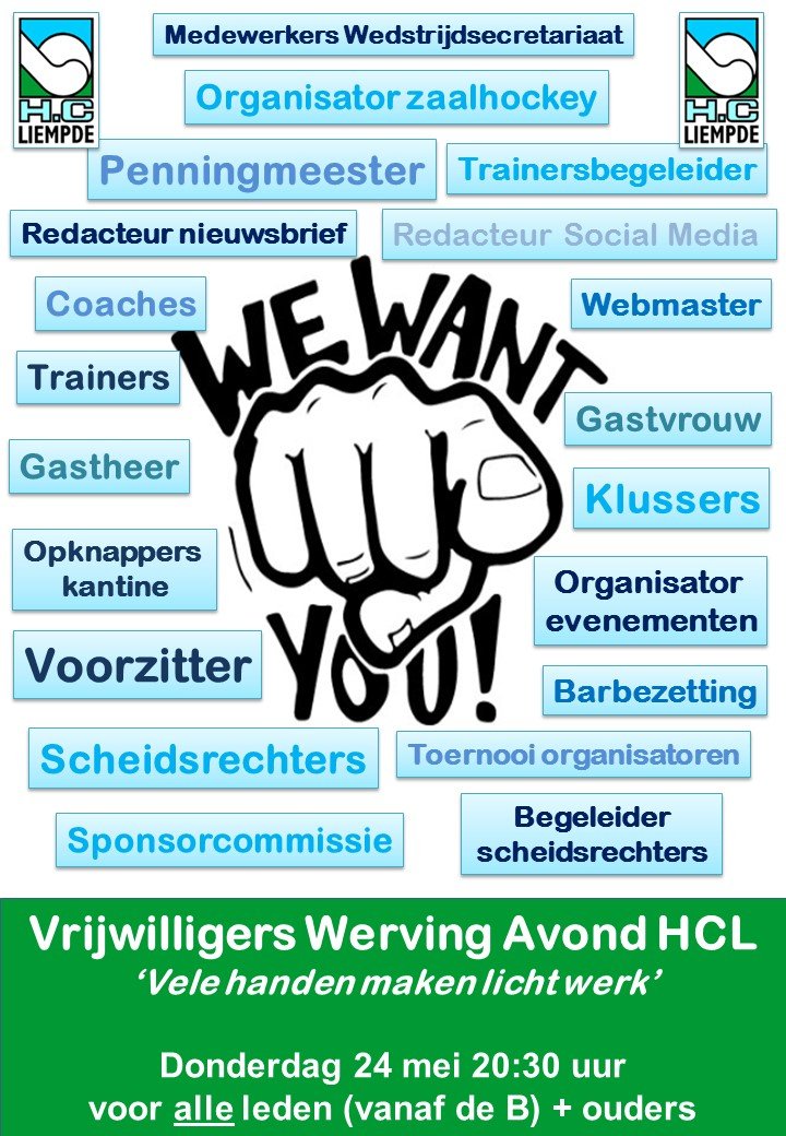 Voor alle senior-leden, A en B jeugdleden, en ouders van (jeugd)leden: HCL heeft jullie nodig om de club draaiend en betaalbaar te houden! Op donderdag 24 mei organiseert het bestuur een avond waar het uit te doeken zal doen wat er aan praktische ondersteuning nodig is. Wij hopen jullie daar allemaal te zien!